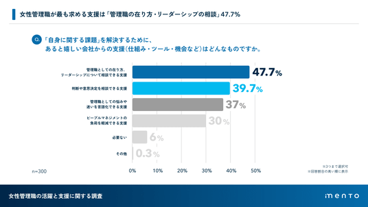 女性管理職が自身の課題を解決するために必要な支援として、最も多かったのは「管理職としての在り方・リーダーシップの相談」(47.7%)でした。続いて、「判断や意思決定を相談できる支援」(39.7%)、「悩みや迷いを言語化できる支援」(37%)が挙げられました。