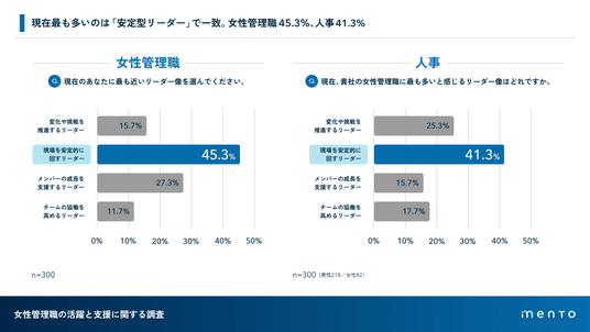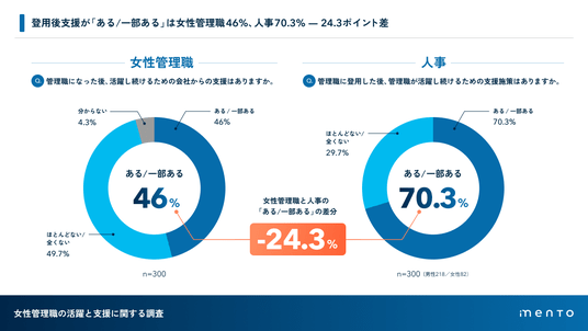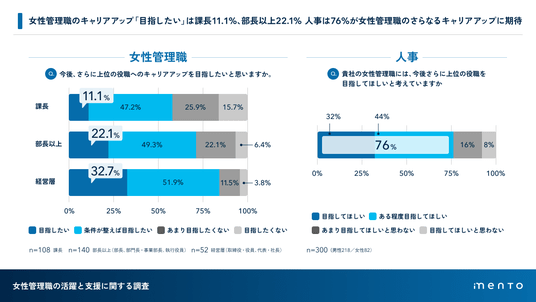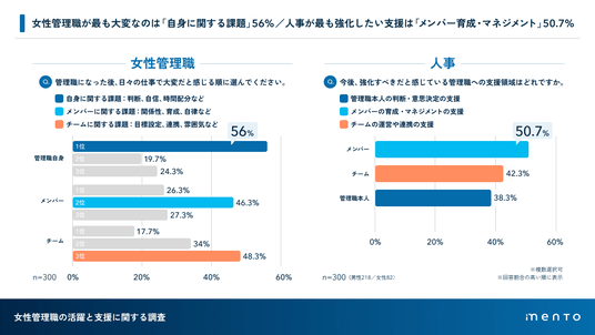 マネジメントサクセスプラットフォーム「mento」を提供する株式会社mento(本社:東京都港区、代表取締役:木村憲仁、以下mento)は、100名以上の企業に勤める女性管理職(課長以上、300名)および人事担当者(300名)を対象に「女性管理職の活躍と支援に関する調査」を実施いたしました。