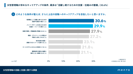 キャリアアップを「条件が整えば目指したい」と回答した女性管理職(n=147)に求める条件を尋ねたところ、「管理職として活躍し続けるための支援や仕組みが整うこと(30.6%)、「メンバーやチームを支えるための仕組み・リソースが整うこと」(29.9%)が上位に挙げられました。