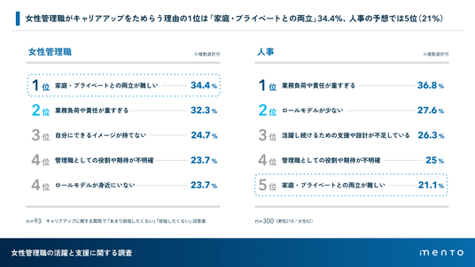 キャリアアップを「あまり目指したくない」「目指したくない」と回答した女性管理職(n=93)に理由を尋ねたところ、1位は「家庭・プライベートとの両立が難しい」(34.4%)でした。一方、人事側の予想では同項目は5位(21.1%)。