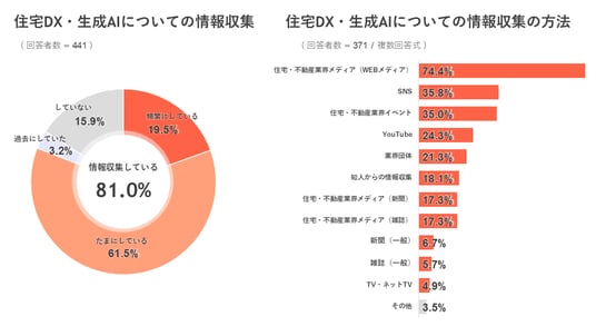 ◆ 住宅DX・AIについて「頻繁に情報収集している」は19.5%、「たまに情報収集している」は61.5%、情報収集に最も活用されているのは「住宅・不動産業界メディア(WEB)」