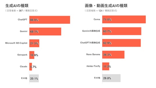 ◆ 利用している生成AIは「ChatGPT」が86.9%で最多、画像・動画生成AIでは「Canva」が71.0%で首位