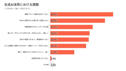 一方で、生成AI活用における課題についての質問では「業務フローに組み込めていない」「社内に活用スキル差があり定着しない」「情報漏洩やセキュリティが心配」などが上位となりました。