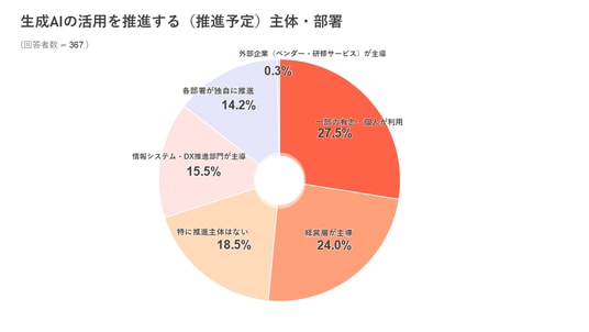 ◆ 推進する(推進予定)主体・部署は「一部の有志・個人が利用」が27.5%で最多、「経営層が主導」が24.0%、「特に推進主体はない」18.5%