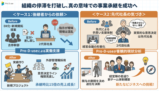 「事業承継において重要かつ困難なのは、法務や税務の手続きだけではなく『人の心と組織の承継』です。私たちは数多くの中小企業の現場で、先代の親心や、古参社員の会社への愛着が、皮肉にも後継者を苦しめている現実を見てきました。親子や長年の付き合いだからこそ言えないこと、進められない改革があります。Pro-D-useは、外部の『社長の右腕』としてその摩擦を吸収するクッションとなり、後継者が胸を張って『自分の会社』と言える状態になるまで、現場で泥臭く支援を続けてまいります。」