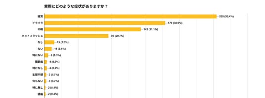 ・症状トップ3:疲労(55.4%)、イライラ(38.9%)、不眠(31.1%)
