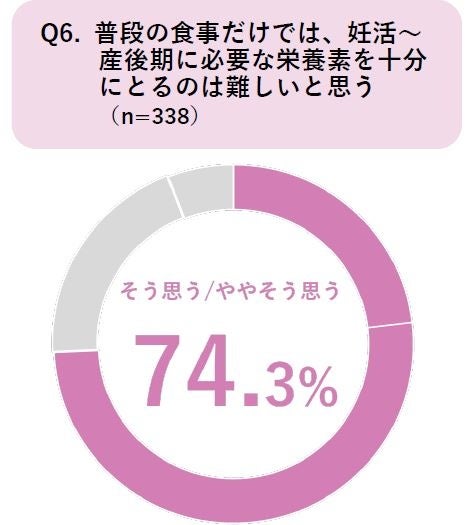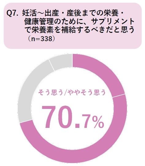 - 74.3%の産婦人科医が「普段の食事だけでは、妊活~産後期に必要な栄養素を十分にとるのは難しいと思う」と回答。また、70.7%が「妊活~出産・産後までの栄養・健康管理のために、サプリメントで栄養素を補給するべきだと思う」と回答。