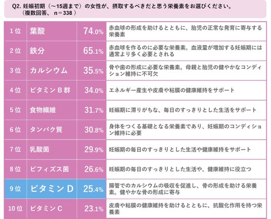 - 「妊娠初期に摂取するべき栄養素」のトップ3は、「妊活期に摂取するべき栄養素」と同じ結果に。これらは胎児の主要な器官や、骨の形成に必要な栄養素です。9位の「ビタミンD」は母体と胎児の健康維持、骨の形成に寄与するため、妊娠期も十分な摂取が必要です。