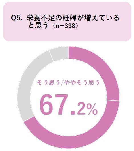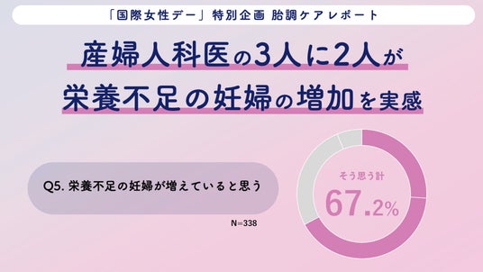 - 今回調査した産婦人科医のうち、実に3人に2人が「栄養不足の妊婦が増えている」と感じている実態が明らかになりました。さらに、74.3%の産婦人科医が「普段の食事だけでは妊活~産後期に必要な栄養素を十分にとることは難しい」と回答。70.7%の産婦人科医が「妊活~出産・産後までの栄養・健康管理のために、サプリメントで栄養素を補給すべき」と考えていることがわかりました。