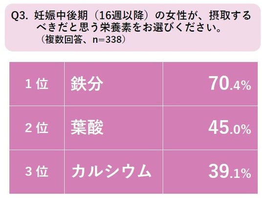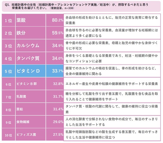 - 産婦人科医が選ぶ「妊活期に必要な栄養素」ランキング1位は「葉酸」、2位は「鉄分」、3位「カルシウム」。5位には現代人が不足しがちと指摘される「ビタミンD」がランクイン。- 一方で産婦人科医の3人に2人※※が「栄養不足の妊婦が増えている」と実感していることが明らかに。※※ 「そう思う」「ややそう思う」の合計