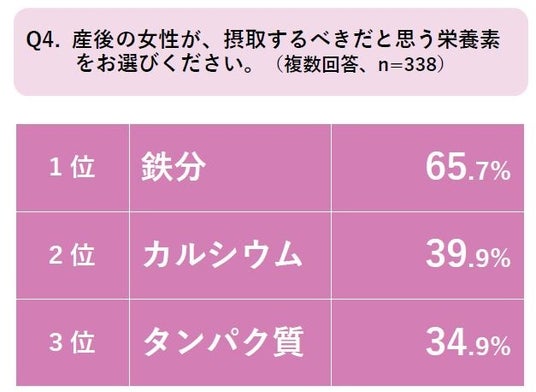 - 「産後に摂取すべき栄養素」の1位も「鉄分」に。出産時の出血によって鉄損失したり、母体の回復に必要なため、産後も鉄分摂取が重要です。母乳中に含まれる「カルシウム」は母体の骨から移行していくため、母親の骨の健康維持のために「カルシウム」は継続的な摂取が有効です。