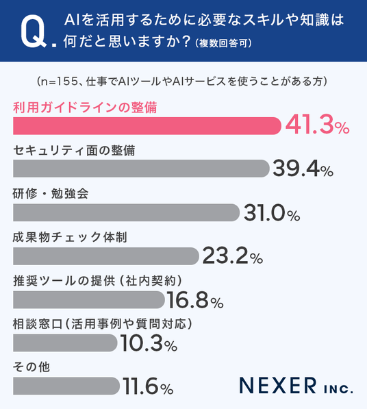 注目すべきは、個人のスキルアップよりも「組織としての環境整備」を求める声が上位を占めている点です。「どこまでAIを使っていいのか」が曖昧なままでは、使いたくても使えない現場の本音が表れた結果といえるでしょう。