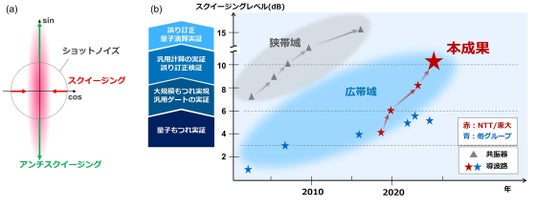 図1 (a) スクイーズド光の量子ノイズ (b)導波路型デバイスによるスクイージングレベルの変遷(広帯域性を発揮する導波路型光デバイスでの高スクイージングレベルが近年求められている)