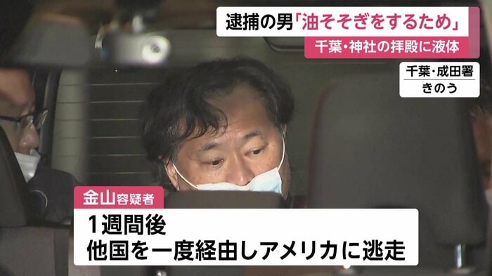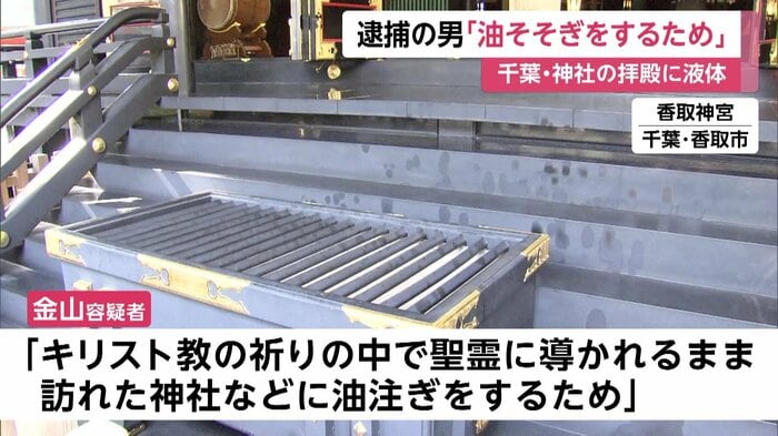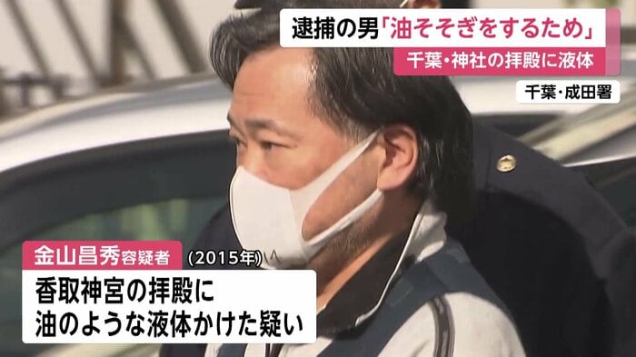 アメリカ在住の金山昌秀容疑者(63)は2015年、千葉・香取市の香取神宮の拝殿に油のような液体をかけた疑いが持たれていて、5日朝に送検された。