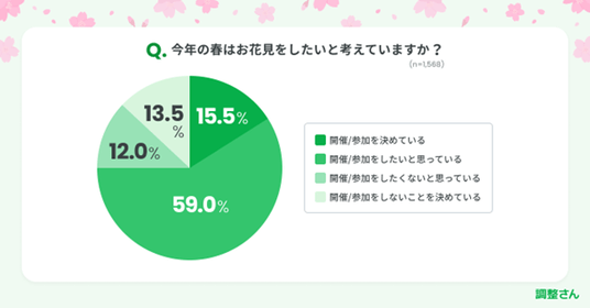 全ての回答者を対象に「今年の春はお花見をしたいと考えているか」質問しました。最も多かったのは「開催/参加をしたいと思っている」で、59%でした。2位は「開催/参加を決めている」で15.5%となり、全体の74.5%が今年の春お花見をしたいと考えていることがわかりました。