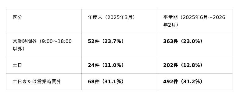 その結果、年度末は平常期と比べて問い合わせが増加し、土日・営業時間外の相談も一定数発生するなど、短納期対応が課題になりやすい傾向が確認されました。