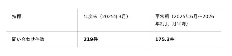 当社の問い合わせデータを匿名化して独自集計し、年度末(2025年3月)と平常期(2025年6月~2026年2月)の差を比較しました。傾向1. 問い合わせ件数は平常期平均比で約25%増