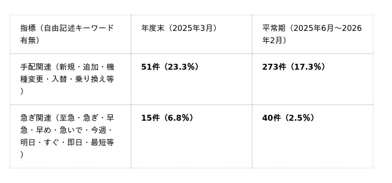 「急ぎ」関連も年度末6.8%、平常期2.5%と差が見られ、年度末は短納期の追加・入替ニーズが顕在化しやすいことが示唆されます。