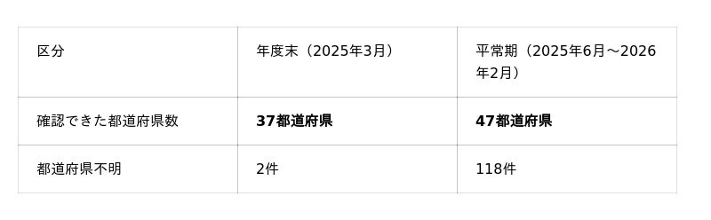 年度末単月でも37都道府県に分布し、短期間でも広域から問い合わせが寄せられました。