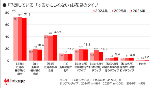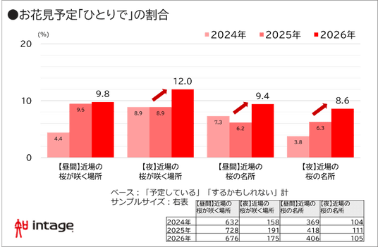 さらに今年は、“ソロ(ひとり)花見”の広がりも注目されます。調査結果からは、昼・夜ともに「近場でひとり」を選ぶ人の割合が昨年から上昇。中でも、夜の近場スポットでは12.0%(前年比1.3倍)と、3年間で最も高い値となりました。