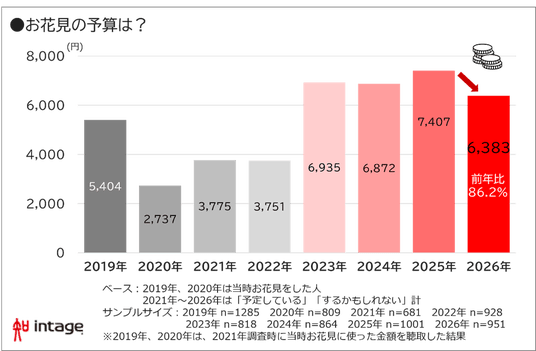 2026年の花見予定率は38.0%と、昨年(40.1%)から2.1ポイント低下しました。前年比94.8%となり、ここ数年続いていた花見行動持ち直しの流れからは、やや後退する結果です。消費全体の節度化が進む中で、レジャー行動にも抑制的な傾向が表れたと考えられます。次に、予算を見ていきます。