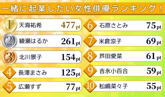 今回は、目標達成に向けた強い精神力や行動力が求められる『起業』において「この人となら一緒に起業してみたい」と思われている女性俳優を調査。
