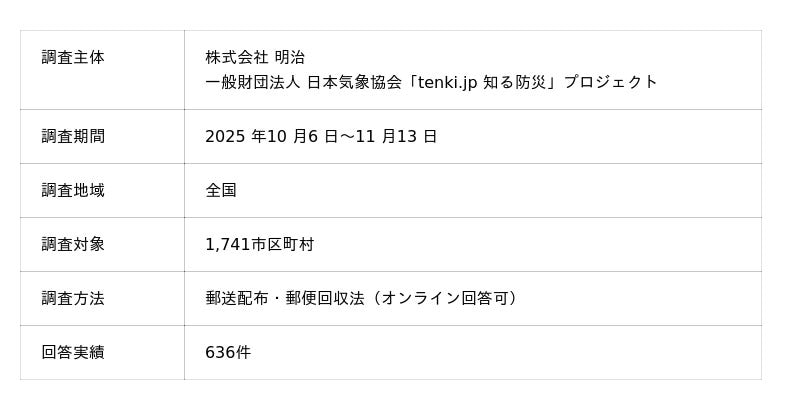 株式会社 明治(代表取締役社長:八尾 文二郎)は、災害備蓄に関するさまざまな活動に取り組む「ほほえみ防災プロジェクト」を通じ、一般財団法人 日本気象協会(理事長:渡邊 一洋)が推進する「tenki.jp 知る防災」プロジェクトと共同で、全国1,741の地方自治体(以下、自治体)を対象に、「災害時における授乳の支援、ならびに母子に必要な物資の備蓄および活用についての全国自治体調査 2025」を実施しました。