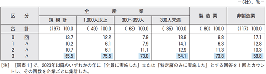 [図表1]で、2023年以降のいずれかの年にベアを「全員に実施した」または「特定層のみに実施した」とする回答を1回とカウントし、その回数を企業ごとに集計することで、2023年以降におけるベアの実施回数を見ると、「3回」ベアを実施したという回答が65.5%と最も多く、「0回」が13.7%、「2回」が10.7%、「1回」が10.2%となっている[図表2]。