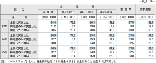 2023年以降におけるベースアップ(以下、本文中では「ベア」と表記)の実施状況を見ると、2023年は、ベアを「全員に実施した」企業は58.4%、「特定層のみに実施した」企業は11.2%、「実施していない」企業は30.5%、2024年は、「全員に実施した」企業は66.5%、「特定層のみに実施した」企業は12.7%、「実施していない」企業は20.8%となり、2025年は規模計においては2024年と同水準である[図表1]。