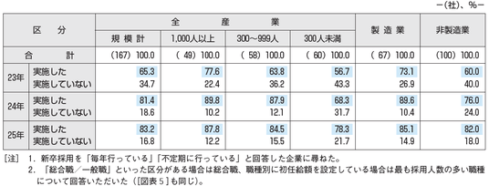 大学卒の新卒採用を「毎年行っている」または「不定期に行っている」企業に、2023年以降における初任給(大学卒)の引き上げ状況を尋ねたところ、2023年は、「実施した」企業は65.3%、「実施していない」企業は34.7%、2024年は、「実施した」企業は81.4%、「実施していない」企業は18.6%、2025年は、「実施した」企業は83.2%、「実施していない」企業は16.8%である[図表4]。