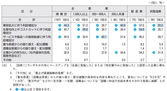 ベア実施企業にベア原資の確保方法(複数回答)を尋ねたところ、「業容拡大に伴う利益増加分」が44.3%で最も多く、次いで「生産性向上やコストカットに伴う利益増加分」が43.7%、「サービスや製品への価格転嫁に伴う利益増加分」が35.9%となっている[図表3]。また、「企業からの持ち出し(社内留保の活用、資産売却など)」も32.9%と3割強が回答している。