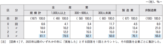 [図表4]で、いずれかの年に引き上げを「実施した」とする回答を1回とカウントし、その回数を企業ごとに集計することで、2023年以降における初任給の引き上げ回数を見ると、「3回」が61.1%と最も多く、「1回」が18.0%、「2回」が14.4%、「0回」が6.6%となっている[図表5]。
