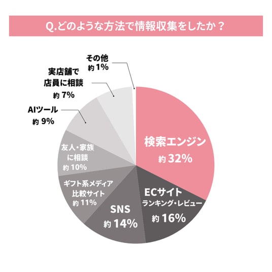 回答者に「ギフトを選ぶ際、どのような方法で情報収集しましたか?」と質問したところ、情報収集手段として最も多かったのは「検索エンジン」(約32%)で、次いで「ECサイトのランキング・レビュー」(約16%)、「SNS」(約14%)と続きました。