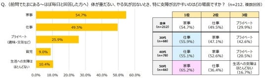 続いて、前問で春先の倦怠感を感じる(たまにある~ほぼ毎日)と答えた人を対象に、特に支障の出やすいシーンを尋ねたところ、全体では「家事」が54.7%で最も多く、次いで「仕事」(49.5%)という結果になりました。この結果を年代別に見ると、50代女性では全体同様に「家事」(65.2%)が最多となった一方で、30代・40代では「仕事」がトップとなりました。