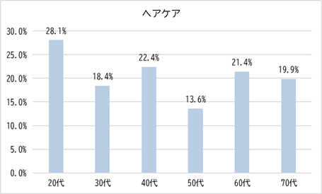 月々の支出全体に占める割合について、各項目の程度を尋ねたところ、「とても占めている」「やや占めている」と回答した人は、全体では「スキンケア」(29.7%)が最も高く、「ファッション」(27.0%)が続きました。「ヘアケア」は20.6%で3位となり、「推し活」や「メイク」を抑え、5人に1人がヘアケアに出費している結果となりました。