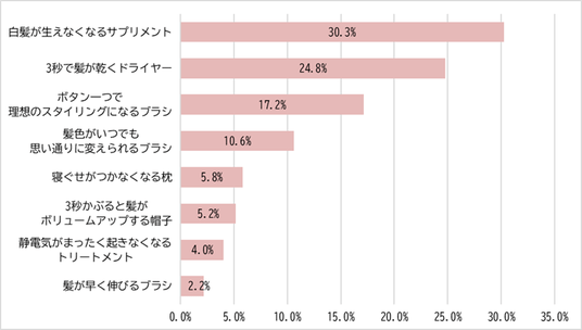 一番欲しいと思う髪に関する仮想グッズを尋ねたところ、全体では「白髪が生えなくなるサプリメント」(30.3%)が最も高く、「3秒で髪が乾くドライヤー」(24.8%)、「ボタン一つで理想のスタイリングになるブラシ」(17.2%)が続きました。