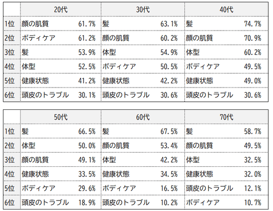 ◆肌や体型を上回り、「髪」が最も多い悩み