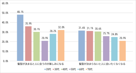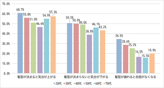 年代別に見ると、「髪型が決まると気分が上がる」は20代で60.7%と最も高く、70代でも他世代を抜いて57.3%と半数を超えており、世代を問わず髪が気分に好影響を与える要素であることが分かりました。中でも特徴的なのが20代で、「髪型が崩れると自信がなくなる」は34.5%と、中高年層と比較すると約2倍の割合となりました。また、「髪型が決まると人に会うのが楽しみになる」(48.1%)といった対人意識に関する項目も他年代より高く、髪型は気分やモチベーションにも影響している傾向がうかがえます。