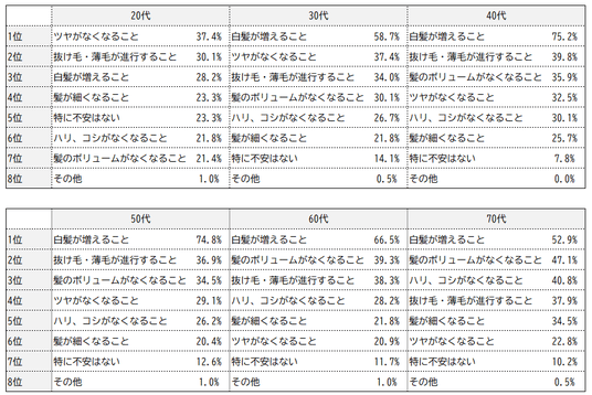 これに対し、「白髪が増えること」は30代以降すべての世代で1位、40代と50代では群を抜いており、大きな関心事となっていることが分かります。また、40代以降からは、「髪のボリュームがなくなること」が3位以内に入り、白髪と並んで、量の変化も同時に気になり始める年代であることが読み取れます。