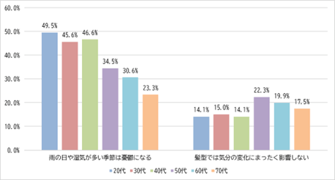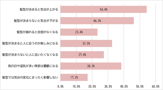 髪型と気分の関係について尋ねたところ、全体の54.4%が「髪型が決まると気分が上がる」と回答しました。また、「髪型が決まらないと気分が下がる」(46.3%)、「雨の日や湿気が多い季節は憂鬱になる」(38.3%)といった回答も多く、髪の状態が日常の心理状態と関係している様子がうかがえます。