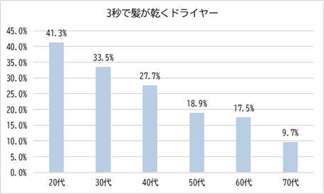 「3秒で髪が乾くドライヤー」は20代で最も高く、年代が上がるにつれて割合が低下しており、若年層ほど効率性を重視し、髪にかける時間を減らしたいという意識が強い傾向が見られます。