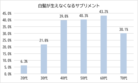 上位3位の項目を年代別に見ると、「白髪が生えなくなるサプリメント」は30代以降で大きく増加し、40代以降では高い水準で推移しています。年齢を重ねるにつれて、ヘアケアに求める欲求が“日常の効率”よりも、白髪といった加齢に伴う“悩みの解消”へと移っていく様子が見られました。