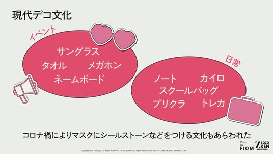 「イベント(サングラス、メガホン等)」と「日常(ノート、カイロ等)」の2つの軸でデコ文化を整理。コロナ禍でマスクをデコる文化が生まれたことも、生活のあらゆる場面にデコが浸透した一因として挙げています。
