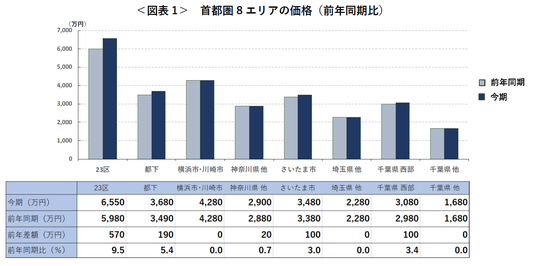 なお、東京都(23区/都下)、横浜市・川崎市、さいたま市、千葉県西部の5エリアは、2017年上期以降最高額。