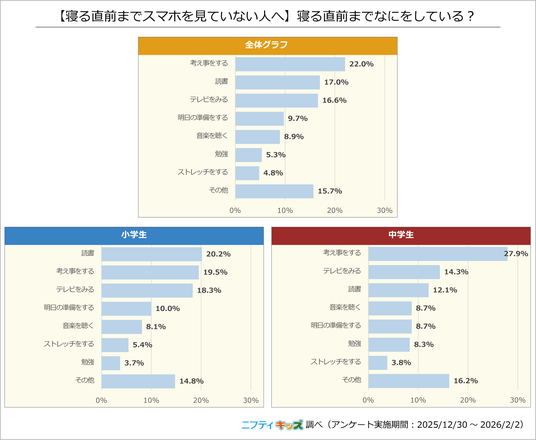 小学生は「読書」が1番多く、次いで「考え事をする」「テレビを見る」と続きました。一方、中学生では寝る直前に考え事をする人が多いことがわかりました。