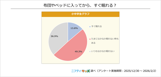 およそ半数の小中学生が「たまになかなか眠れない時もある」と回答しました。次に「いつもなかなか眠れない」が多く、「すぐ眠れる」人は13.8%にとどまりました。