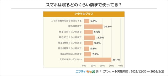 スマートフォンを持っていないと回答した人が最も多く29.7%でした。スマートフォンを持っている人の中では、「眠る直前まで」使っている人が最多で、次いで「30分前」「1時間前」「15分前」と続きました。