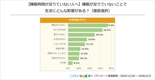 「朝起きられない」が最も多く、「あくびが出る」「集中できない」と続きました。さらに「元気が出ない」「いらいらする」「体調が悪い」と、睡眠不足が日常生活に大きな影響を及ぼしていることがわかりました。