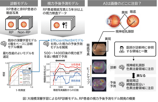 千葉大学大学院医学研究院の馬場 隆之教授、川上 英良教授らの研究グループは、進行すると失明に至る遺伝性の指定難病である、網膜色素変性症(Retinitis Pigmentosa、以下RP)について、眼底写真を用いた既存の大規模深層学習モデルをベースに、RP診断およびRP患者の視力予後予測を行う方法を開発しました。眼底写真からRPを高精度に診断できることを示すとともに、眼底写真と視力の時系列データを学習することで、将来の視力低下を安定して高い精度で予測できることを明らかにしました。さらに、診断と予後予測でAIが重視する網膜領域の違いを可視化し、RPの病態理解につながる知見を得ました。研究グループが開発したモデルは今後、早期に視力喪失が予想される患者への迅速な治療介入につながり、 RP診療における新たな意思決定支援の基盤構築に寄与すると期待されます。