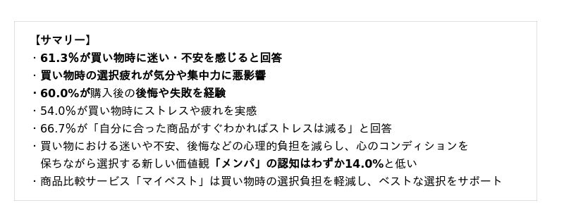 【マイベスト|買い物のストレス・選択疲れに関する調査】61.3%が買い物で迷い・不安を実感。情報過多による“選択疲れ”がメンタルに影響。新価値観「メンパ」を意識した買い物が重要。